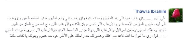 وعلقت Thawra Ibrahimساخرة: “على يدى ……..الإرهاب هوه اللى هد المليون وحدة سكنية والإرهاب اللى ردم المليون فدان المستصلحين والإرهاب اللي لهف فلوس المؤتمر الاقتصادي والإرهاب اللي كسر جهاز الكفتة، والإرهاب اللي منع استخراج الغاز من البير الجديد وخلاكم تستوردوه من اسرائيل والإرهاب اللى بوظ مباني العاصمة الجديدة والإرهاب اللي سرق معونات الخليج …….قول زي ما تقول ما انت قاعد مع اهلك وعشيرتك خد راحتك على الآخر هوه حد هيقوم ويقولك يا كذاب مثلا”.