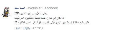 وتساءل أحمد سعد: “يعني دخل من غير تاشيرة؟؟؟؟ إذا كان أبو مازن نفسه بيدخل بتأشيرة إسرائيلية، طيب إيه حكاية إن السفير الإسرائيلى كان مسافرًا على نفس الطائرة؟؟”.