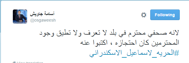 وقال الناشط الحقوقي جمال عيد: “على السلطات المصرية إطلاق سراح الصحفي والباحث #إسماعيل_الإسكندراني فورًا”.
