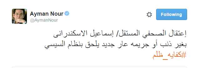 واعتبر الدكتور أيمن نور، رئيس حزب “غد الثورة”، أن اعتقال الصحفي إسماعيل الإسكندراني “بغير ذنب أو جريمة عار جديد يلحق بنظام السيسي”.