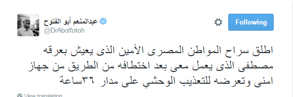 فيما أعلن “أبو الفتوح” بعد ذلك إطلاق قوات الأمن لسائقه الخاص بعد تعرضه للتعذيب؛ إذ قال -عبر “تويتر”- “أطلق سراح المواطن المصري الأمين الذي يعيش بعرقه مصطفى الذي يعمل معى بعد اختطافه من الطريق من جهاز أمني وتعرضه للتعذيب الوحشي على مدار ٣٦ ساعة”.
