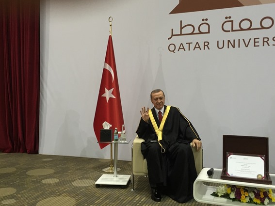 رفع الرئيس التركي، رجب طيب أردوغان، “شارة رابعة”، اليوم الأربعاء، خلال زيارته لجامعة قطر، وذلك قبل إلقاء محاضرة أمام الحضور بالجامعة، ضمن برنامج زيارته للدوحة.