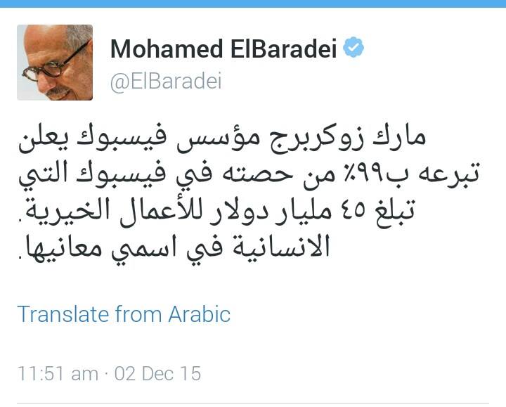 وقال البرادعي -في تغريدة له عبر موقع التغريدات القصيرة “تويتر”-: “مارك زوكربرج مؤسس “فيس بوك” يعلن تبرعه بـ99% من حصته في “فيس بوك” التي تبلغ 45 مليار دولار للأعمال الخيرية”، مضيفًا “الإنسانية في أسمى معانيها”.