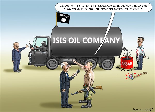 وسخر “بولتيكال كارتونز” من اتهامات الرئيس الروسي فلاديمير بوتين للرئيس التركي رجب طيب أردوغان يتلقيه تمويلاً نفطيًا من تنظيم الدولة بهذا الرسم: