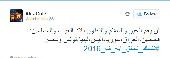 Ali : “أتمنى أن يعم الخير والسلام والتطور بلاد العرب والمسلمين، فلسطين، العراق، سوريا، اليمن، ليبيا، تونس ومصر”.