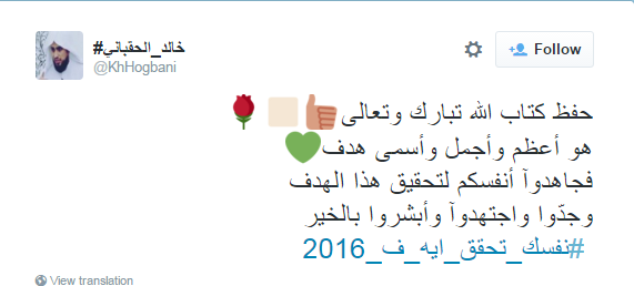 -خالد الحقباني: “حفظ كتاب الله تبارك وتعالى هو أعظم وأجمل وأسمى هدف، فجاهدوا أنفسكم لتحقيق هذا الهدف، وجدّوا واجتهدوا وأبشروا بالخير”.