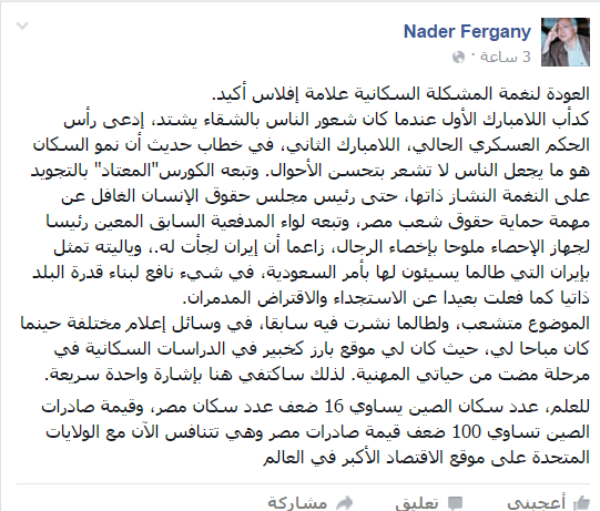 أعتبر نادر فرجاني، استاذ العلوم السياسية بجامعة القاهرة، أن سير النظام العسكري الحالى على نسق المخلوع حسني مبارك، وعودة نغمة المشكلة السكانية، وأنها السبب في عدم تحسن الأحوال، "علامة إفلاس أكيد".