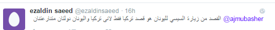– ezaldin saeed: “القصد من زيارة السيسي لليونان هو قصد تركيا فقط؛ لأن تركيا واليونان دولتين متنارعتين”.