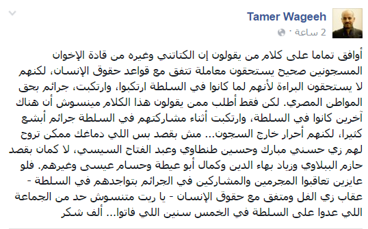 واستطرد: “فلو عايزين تعاقبوا المجرمين والمشاركين في الجرائم بتواجدهم في السلطة -عقاب زي الفل ومتفق مع حقوق الإنسان- يا ريت متنسوش حد من الجماعة اللي عدوا على السلطة في الخمس سنين اللي فاتوا… ألف شكر”.