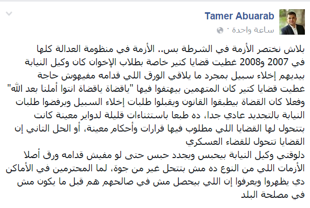 أكد الكاتب الصحفي تامر أبو عرب، أن الأزمة التي تعيشها مصر من انتهاكات لحقوق الإنسان ليست في جهاز الشرطة فقط، وإنما في منظومة العدالة بأكملها”.