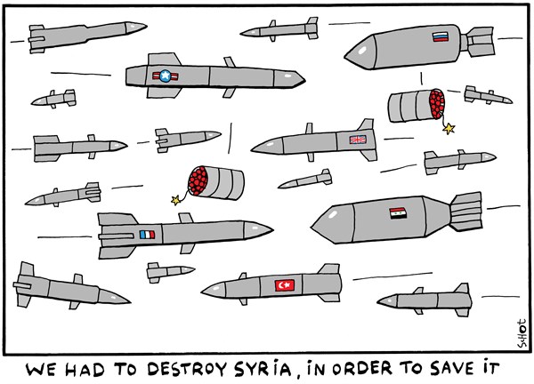 ولا نزال مع موقع “كاجل” الذي رسم هذا الكاريكاتير عن الوضع السوري المعبر عن محاولات دول العالم إنقاذ سوريا بتدميرها: