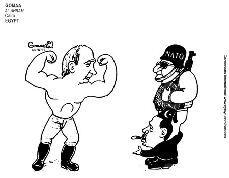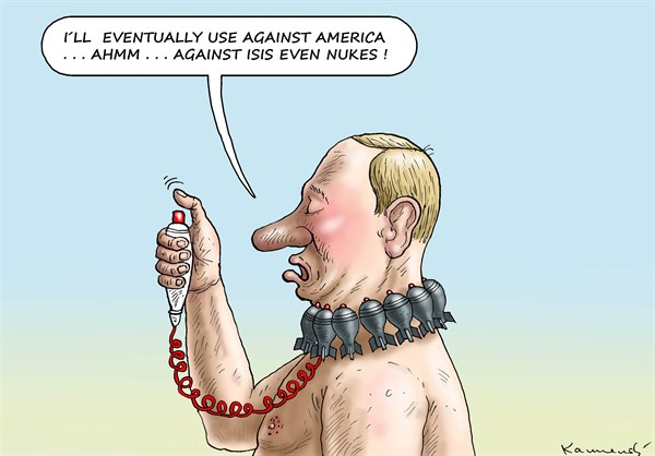 أما عن محاربة بوتين لتنظيم الدولة فسخر موقع “بولتيكال كارتونز” بهذا الرسم: