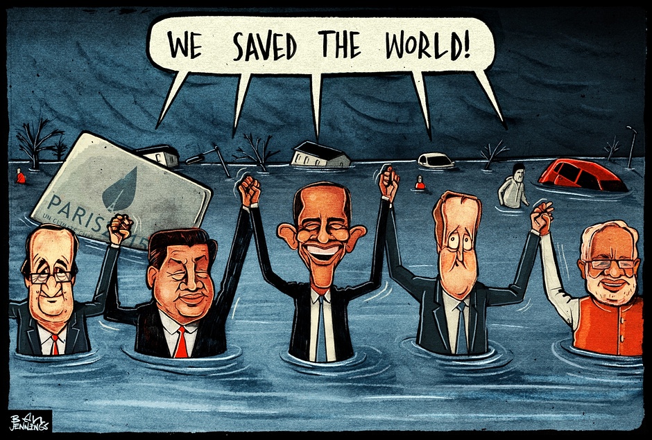 ونشرت جريدة “الجارديان” البريطانية هذا الرسم ساخرة من مؤتمر المناخ العالمي بباريس؛ حيث صورت العالم يغرق فيما يدعي قادة العالم أنهم يعملون على حمايته: