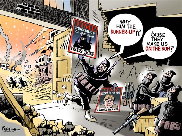 تداولت صحف ومواقع عالمية اليوم رسوما كاريكاتورية تسخر من عدد من القضايا العالمية، مثل أسلوب محاربة بوتين لتنظيم الدولة، وأيضًا من تدخلات تركيا في الشأن العراقي، وتصريحات ترامب المعادية للإسلام، ومحاولات إنقاذ المناخ العالمي.
