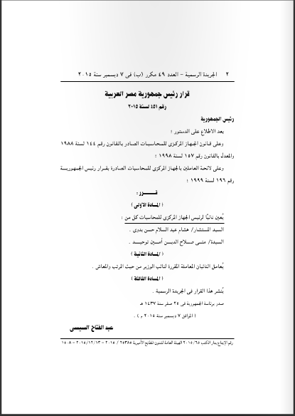 أصدر عبدالفتاح السيسي، القرار الجمهوري رقم 451 لسنة 2015، بتعيين كل من المستشار هشام عبدالسلام حسن بدوي، ومنى صلاح الدين أمين توحيد، نائبين لرئيس الجهاز المركزي للمحاسبات.