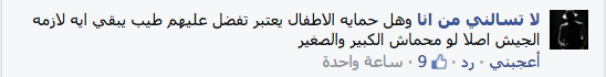 وقال حساب آخر على “فيس بوك تعليقًا على الصورة :”وهل حمايه الاطفال يعتبر تفضل عليهم طيب يبقي ايه لازمه الجيش اصلا لو محماش الكبير والصغير”.