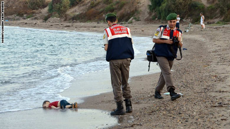 تداول نشطاء على موقع التواصل الاجتماعي “فيس بوك” صورة معلقة على لافتة بالطريق الصحراوي وتحمل صورة الطفل السوري الغارق “عيلان الكردي”.