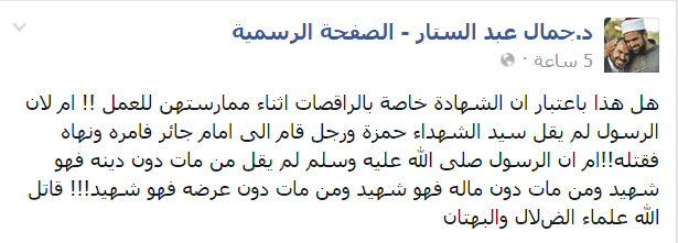 واستنكر “عبدالستار” الفتوى عبر منشور له على صفحته الرسمية عبر “فيس بوك” قال فيه: “هل هذا باعتبار أن الشهادة خاصة بالراقصات أثناء ممارستهن للعمل!! أم لأن الرسول لم يقل سيد الشهداء حمزة ورجل قام إلى إمام جائر فأمره ونهاه فقتله!!”.