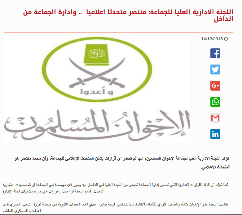 أكدت اللجنة الإدارية العليا لجماعة الإخوان المسلمين، أنها لم تصدر أية قرارات بشأن المتحدث الإعلامي للجماعة، وأن محمد منتصر هو المتحدث الإعلامي.