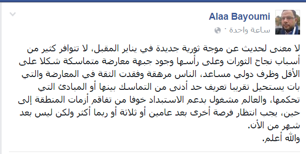 وتابع “بيومي” منشوره قائلاً: “العالم مشغول بدعم الاستبداد خوفًا من تفاقم أزمات المنطقة إلى حين، يجب انتظار فرصة أخرى بعد عامين أو ثلاثة أو ربما أكثر ولكن ليس بعد شهر من الآن”.