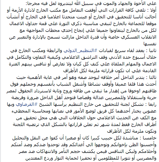 أولاً: تلغى كافة القرارات التي أوقفت التعامل مع مكتب الخارج لإدارة الأزمة أو أحالت أناسًا إلى التحقيق في الخارج أو عينت متحدثًا إعلاميًا في الخارج أو أنشأت موقعًا للجماعة بالخارج لتبقى مناسبة ذكرى الثورة على قمة جداول الأعمال لكل من بالخارج ليتعاونوا جميعًا على إنجاح إحدى محطات المواجهة مع الانقلاب العسكري، خاصةً أن قدرة الداخل ما زالت تسمح بالإدارة والتعبير عن نفسها.