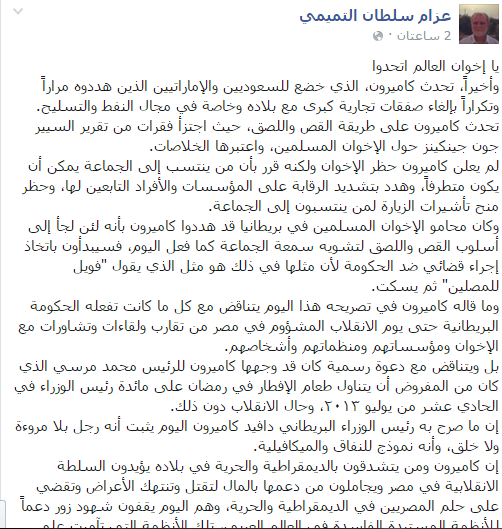 وقال “التميمي” -عبر منشور له على حسابه في موقع “فيس بوك”-: “كاميرون تحدث على طريقة القص واللصق؛ حيث اجتزأ فقرات من تقرير السير جون جينكينز حول الإخوان المسلمين، واعتبرها الخلاصات”، مشيرًا إلى أن كاميرون لم يعلن حظر الإخوان ولكنه قرر أن من ينتسب إلى الجماعة يمكن أن يكون متطرفًا، وهدد بتشديد الرقابة على المؤسسات والأفراد التابعين لها، وحظر منح تأشيرات الزيارة لمن ينتسبون إلى الجماعة.