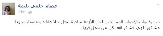 وقال تليمة في تدوينة له عبر حسابه الشخصي على موقع التواصل الاجتماعي “فيس بوك”: “مبادرة نواب الإخوان المسلمين لحل الأزمة مبادرة تمثل حلا عاقلا ومنصفا، وجهدا مشكورا لهم، فشكر الله لكل من عمل فيها”.