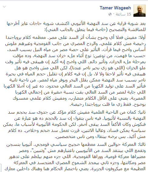واختتم “وجيه” منشوره بالنقطة الرابعة التي قال فيها: “الشيء الجوهري في قصة السد هو إنه بيوضح إن البشر المظلومين هنا وفي إثيوبيا محتاجين منظور تاني للتعامل مع القصة كلها، منظور مش مبني على نوستالجيا مصرية لعصور السيادة على إفريقيا والعرب (أيام ما كان محدش يجرؤ يقف قدامنا)، ولا مبني على محاولة إثيوبية لتحقيق مجد قومي، بل مبني على منظور تعاون حقيقي بين شعوب المنطقة”.