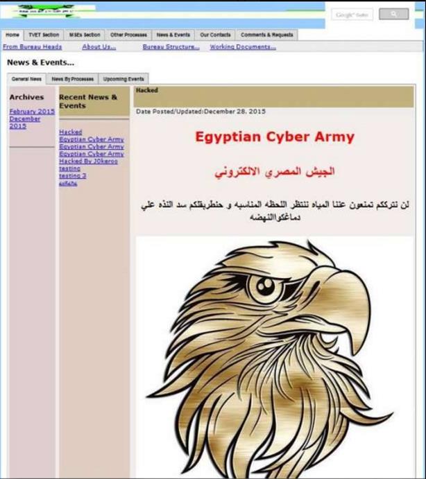 اخترق عدد من القراصنة المصريين الموقع الحكومي لسد النهضة الإثيوبية، محذرين إثيوبيا من منع المياه عن مصر ومهددين بتدمير السد، تاركين رسالة باسم “الجيش المصري الإلكتروني” للجانب الإثيوبي محتواها: