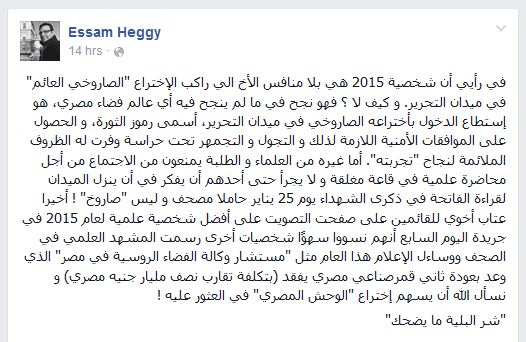 وكتب “حجي”: “في رأيي أن شخصية 2015 هي بلا منافس الأخ اللي راكب الاختراع “الصاروخي العائم” في ميدان التحرير، وكيف لا؟ فهو نجح في ما لم ينجح فيه أي عالم فضاء مصري، هو استطاع الدخول باختراعه الصاروخي في ميدان التحرير، أسمى رموز الثورة، والحصول على الموافقات الأمنية اللازمة لذلك والتجول والتجمهر تحت حراسة وفرت له الظروف الملائمة لنجاح تجربته”.