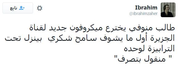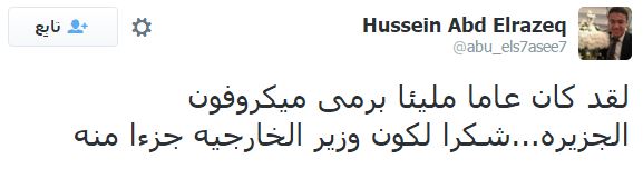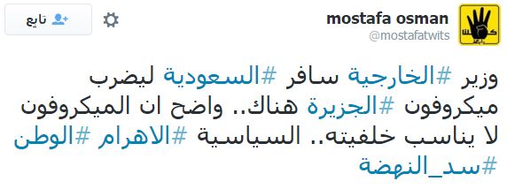وعلّق المدون مصطفى عثمان قائلًا: “وزير الخارجية سافر السعودية ليضرب ميكروفون الجزيرة هناك.. واضح إن الميكروفون لا يناسب خلفيته.. السياسية #الأهرام #الوطن #سد_النهضة”.
