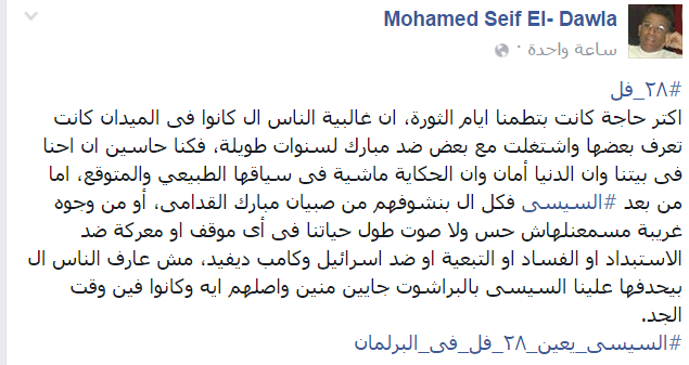 وقال “سيف الدولة” -في منشور له على “فيس بوك” تحت عنوان “السيسي يعين 28 فل في البرلمان”-: “مش عارف الناس اللي بيحدفها علينا السيسي بالبراشوت جايين منين وأصلهم إيه وكانوا فين وقت الجد“.