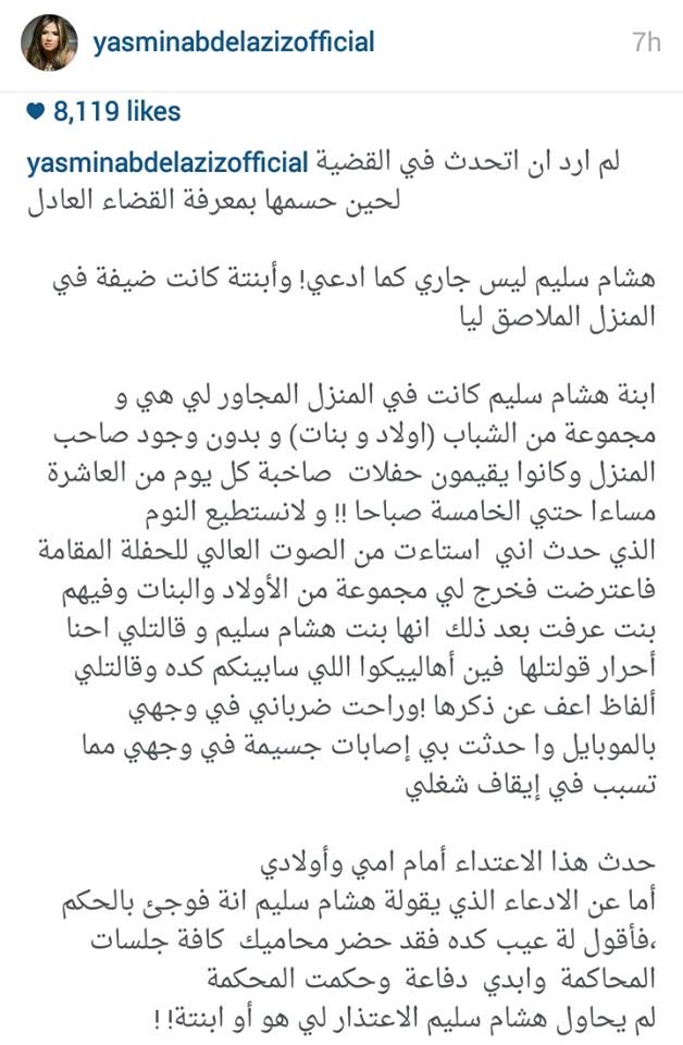 وقالت ياسمين عبدالعزيز عبر صفحتها الرسمية بموقع “إنستجرام”: “لم أرد أن أتحدث في القضية لحين حسمها بمعرفة القضاء العادل”، موضحة أن الفنان هشام سليم ليس جارها كما صرح من قبل، وأن ابنته كانت ضيفة في المنزل الملاصق لها، بصحبة مجموعة من الشباب (أولاد وبنات)، ودون وجود صاحب المنزل.