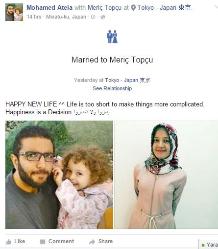 نال زواج المصري "محمد عطية" من اليابانية "Meriç Topçu" اعجاب الكثير من رواد الفيس بوك، حيث قال " عطية في منشور له : "أنا إتجوزت النهاردة" موضحا أن اصدقاءه فوجئوا بقرار وسرعة إتمام زواجه.