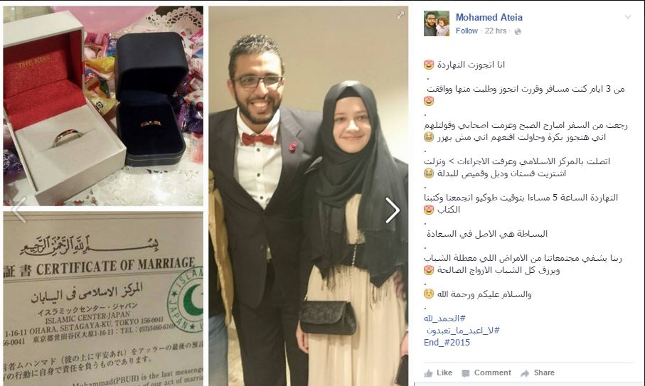 مصري يتزوج في طوكيو.. تلقي ٤ الاف تهنئة و٤٦ ألف لايك على “فيس بوك”