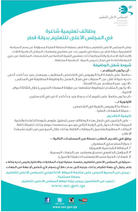 وجاء في الإعلان أن دولة قطر تطلب مدرسين لجميع مراحل التعليم “الابتدائية والإعدادية والثانوية”، موضحًة أنه يمكن التقدم على الإنترنت من خلال تسجيل طلب الحصول على وظيفة بالمجلس الأعلى للتعليم بقطر.