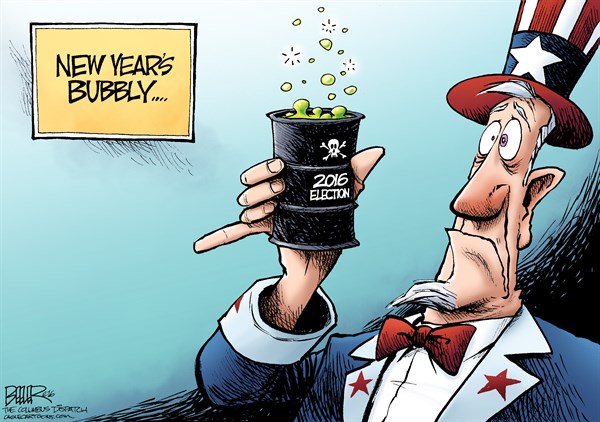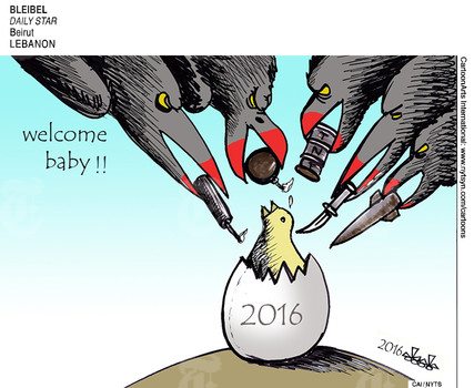 تداولت صحف ومواقع عالمية رسوما ساخرة من أزمات العالم، خاصة مع حلول العام الجديد حيث لم يتخلص العالم من إرهاب تنظيم الدولة، وكذلك اقتراب موعد الانتخابات الرئاسية الأميركية، وتعدد الأزمات الاقتصادية.