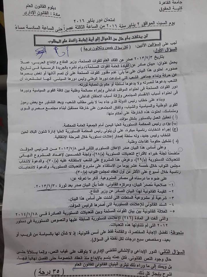 في إطار تفاعل “رصد” مع قرائها أرسل أحد الطلاب بكلية الحقوق بجامعة القاهرة رسالة تحتوي على ورقة أسئلة لامتحان مادة “القانون الإداري”، لطلاب دبلوم القانون العام، ويحتوي الامتحان على سؤالين؛ تعلق السؤال الأول بالبيان الذي أصدره عبدالفتاح السيسي في الثالث من يوليو عام 2013.