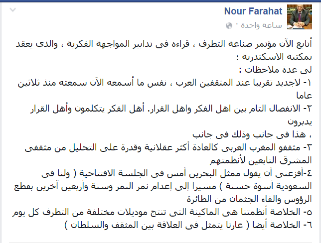 وقال “فرحات” -عبر منشور له في حسابه على موقع “فيس بوك”-: “لي عدة ملاحظات على مؤتمر صناعة التطرف: