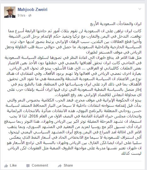 وقال “زويري” -في منشور له بصفحته على موقع التواصل الاجتماعي “فيس بوك”-: أن الأمور الأربعة هي: “التدخل في اليمن، والتقارب مع تركيا، وتنفيذ حكم الإعدام برجل الدين الشيعي، وأخيرًا قطع العلاقات بين البلدين”.