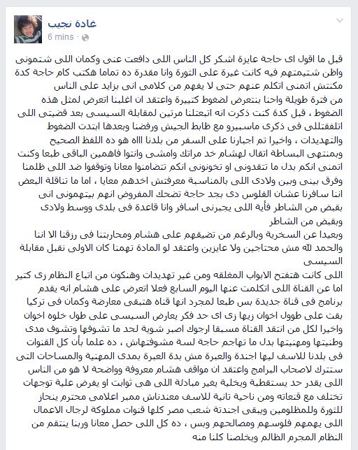 وكتب غادة نجيب: “من فترة طويلة وإحنا بنتعرض لضغوط كتيرة وأعتقد إن أغلبنا اتعرض لمثل هذه الضغوط، قبل كده كنت ذكرت إنه اتبعت لنا مرتين لمقابلة السيسي بعد قضيتي اللي اتلفقت لي في ذكرى ماسبيرو مع ظابط الجيش ورفضنا وبعدها ابتدت الضغوط والتهديدات، وأخيرا تم إجبارنا على السفر من بلدنا أه هو ده اللفظ الصحيح وبمنتهى البساطة اتقال لهشام خد مراتك وامشي”.