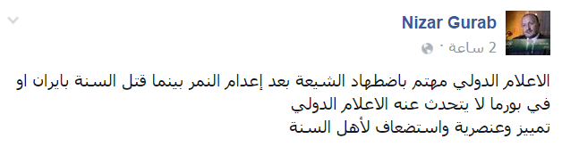 وقال -عبر منشور له على “فيس بوك”-: “النمر طالب بالديمقراطية وتم إعدامه فأدانت الإعدام الأمم المتحدة ومجلس حقوق الإنسان وأميركا والاتحاد الأوروبي، بينما بعض السنة المطالبين بالديمقراطية تصدر تقارير باعتبارهم إرهابيين”.