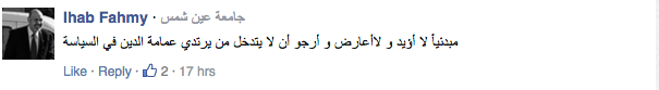 وعلق “إيهاب فهمي” قائلًا: “مبدئيا لا أؤيد و لا أعارض و أرجو ألا يتدخل من يرتدي عمامة الدين في السياسة”