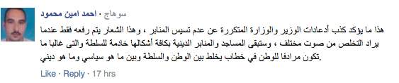 وقال أحمد أمين محمود: “هذا ما يؤكد كذب ادعادات الوزير والوزارة المتكررة عن عدم تسيس المنابر، وهذا الشعار يتم رفعه فقط عندما يراد التخلص من صوت مختلف، وستبقى المساجد والمنابر الدينية بكل أشكالها خادمة للسلطة والتي غالبا ما تكون مرادفا للوطن في خطاب يخلط بين الوطن والسلطة وبين ما هو سياسي وما هو ديني”.