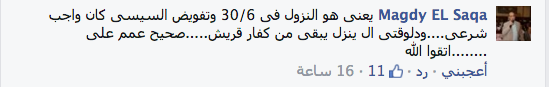 وعلق “مجدي السقا” قائلًا: “يعني هو النزول في 30/6 وتفويض السيسي كان واجب شرعي.. ودلوقتي اللي ينزل يبقى من كفار قريش.. صحيح عمم على.. اتقوا الله”.