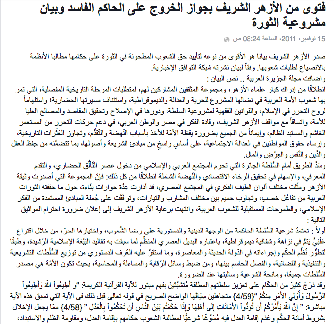 وقال الشيخ خالد خليف، أحد علماء الأزهر وعضو هيئة علماء الجمعية الشرعية: إن الخروج على الظلم جائز شرعًا، وذلك لقول الله سبحانه وتعالى: (لا يحب الله الجهر بالسوء من القول إلا من ظلم)، وقول الرسول صلى الله عليه وسلم لصحابته عندما سمع صوت أحد الأشخاص وهو يطالب بحقه: “دعوه فإن لصاحب الحق مقالة”.