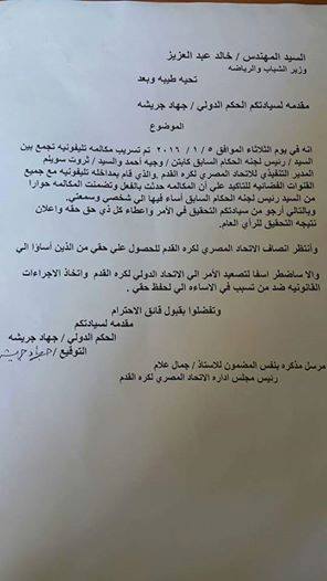 وأرسل جريشة خطابا رسميا إلى خالد عبد العزيز، وزير الشباب والرياضة، يطالبه بالتدخل وحل الأمر في أسرع وقت ومحاسبة المخطئ.