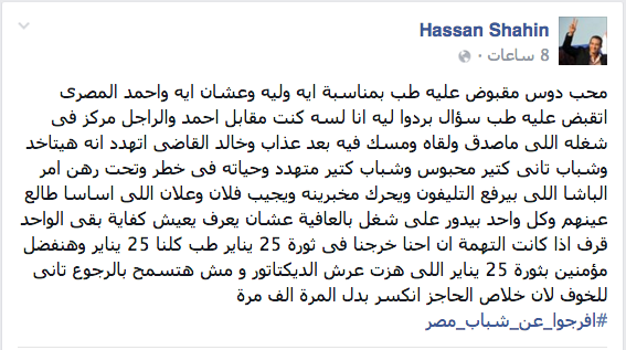 وقال “شاهين” -في منشور له على حسابه في موقع “فيس بوك”-: “محب دوس مقبوض عليه.. طب بمناسبة إيه وليه وعشان إيه؟ وأحمد المصري اتقبض عليه.. طب سؤال بردو ليه؟ أنا لسه كنت مقابل أحمد والراجل مركز في شغله اللي ماصدق ولقاه ومسك فيه بعد عذاب”.