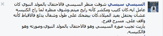 وقال حساب آخر: “شوفت منظر السيسي في الاحتفال بالمولد النبوي كان عامل ايه، كان كئيب ومكشر كأنه رايح ميتم، وشوف منظره لما راح الكنيسة عشان يحتفل بعيد الميلاد، كان بيضحك على طول وشغال يدلع في الأقباط كأنه واقف على مسرح في فرح”.