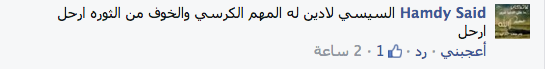 وأكد حمدي سعيد: “السيسي لا دين له المهم الكرسي والخوف من الثورة”.